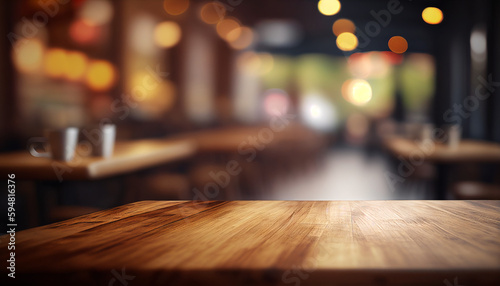 Empty wooden table with blurred background, planks against a blurry background, Generative AI