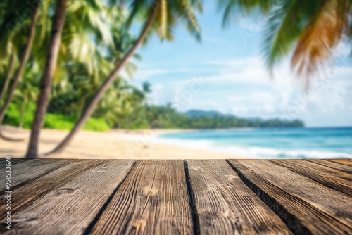 Empty wooden table with blurred beach with coconut trees in the background with generative ai