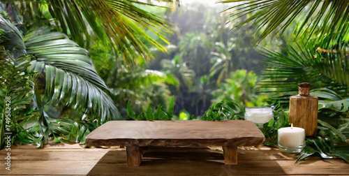 Empty wooden table with candle, for product presentation, background of a forest landscape, mockup for presenting a natural product.