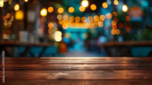 Empty wooden table with christmas theme in background, Warm Glow: A Cozy Evening at a Wooden Table
