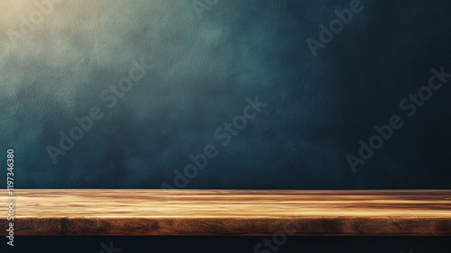 Empty wooden table with dramatic dark stormy sky background, mystical minimalist nature landscape against rustic surface