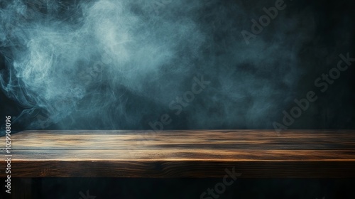 Empty wooden table with smoke floating up against dark background for dramatic and atmospheric design projects