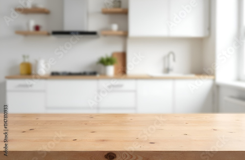 Empty wooden table with the bright white interior of the kitchen as a blurred background behind. Blurred background, selective focus.
