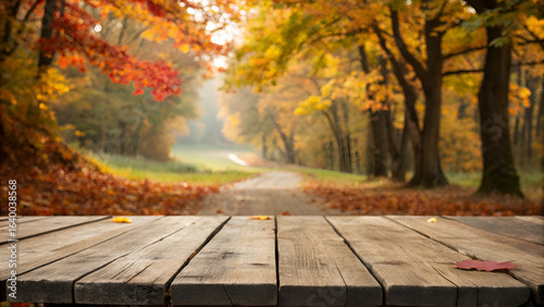 Empty wooden table with warm autumn colors and blurred foliage background, perfect for seasonal product display and advertising.