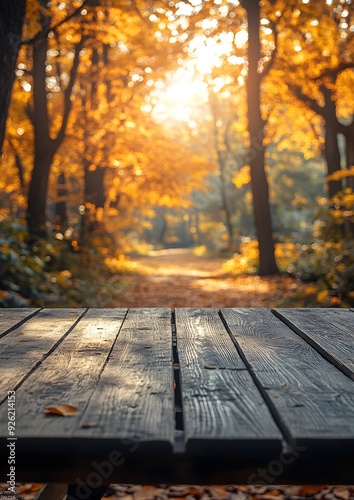 Empty wooden table with warm autumn park background, sunlight filtering through trees, perfect for product display.