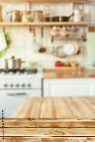 Empty Wooden Tabletop for Kitchen Product Display in Blurred Background