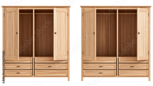Empty wooden wardrobe with open doors and drawers on transparent background