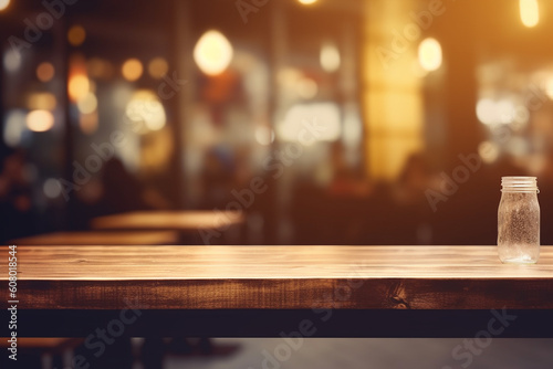 Empty wooden work table in restaurant. Blurred bokeh background.