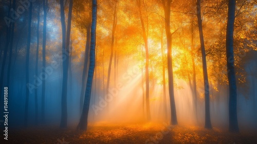Enchanted Autumn Forest with Sunlight and Misty Atmosphere