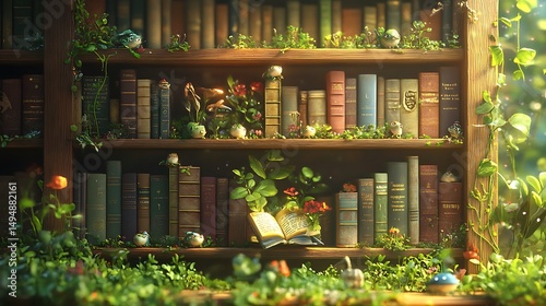 Enchanted bookshelf brimming with ancient tomes, flora, and tiny avian inhabitants