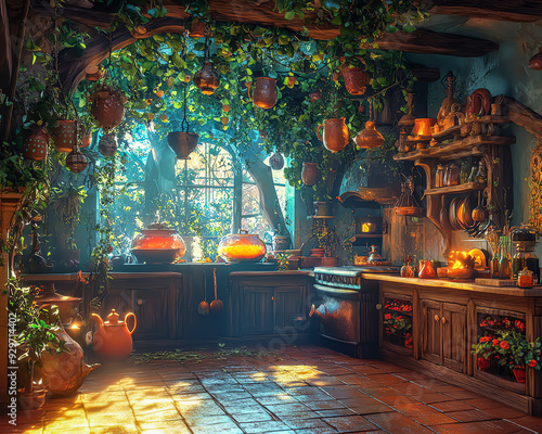 Enchanted cottage kitchen with lush greenery, rustic charm, and a window overlooking a magical garden.