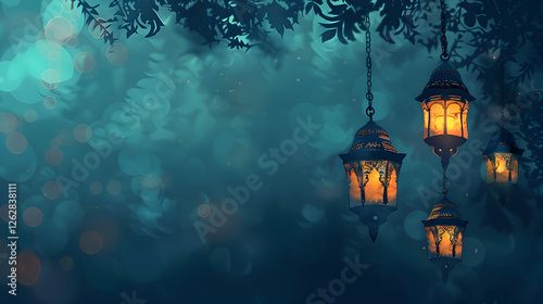 Enchanted evening scene with glowing lanterns hanging amidst soft bokeh background