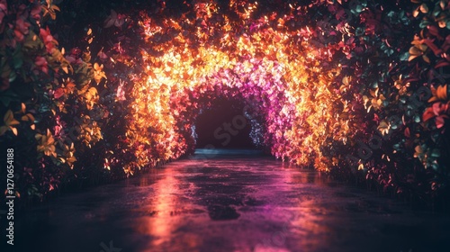 Enchanted Floral Tunnel Illuminated by Colorful Lights and Reflections on Wet Surface in a Mystical Forest Setting