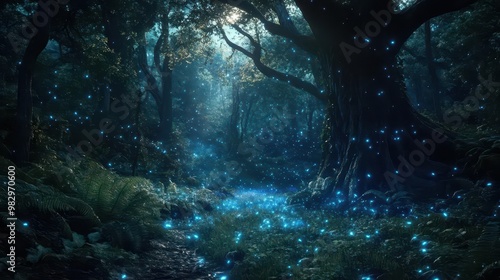 enchanted forest bathed in ethereal light ancient trees with gnarled roots frame a mystical clearing lush ferns and bioluminescent flora create magical ambiance