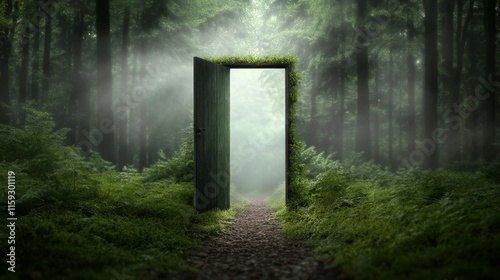 Enchanted Forest Doorway Surrounded by Lush Greenery and Mist, Inviting Exploration into a Mystical Natural Landscape