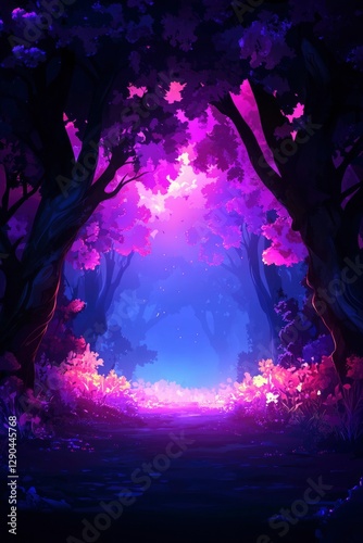 Enchanted forest path, glow, fantasy background image, illustration for fairy tale book