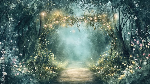 Enchanted forest path illuminated with fairy lights and delicate floral details watercolor painting