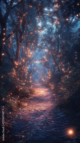 Enchanted Forest Pathway Illuminated By Soft Glowing Lights Beneath A Starry Night Sky - Featuring Nature's Beauty And Mystical Atmosphere