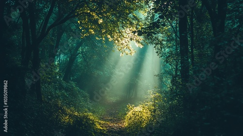 Enchanted Forest with Sunlight Glimmering Through Trees