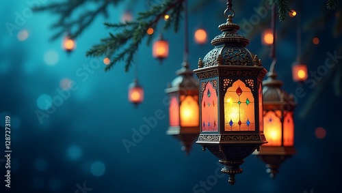 Enchanted Night: Luminous Lanterns Hanging from a Branch