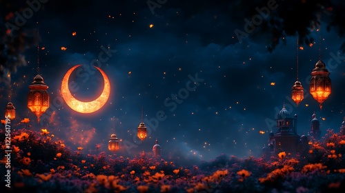 Enchanted Night Scene with Lanterns and Crescent Moon