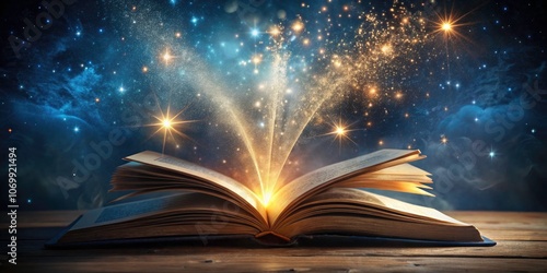 Enchanted Open Book Surrounded by Magic Dust and Glowing Stars in Low Light Photography for Fantasy and Imagination Themes