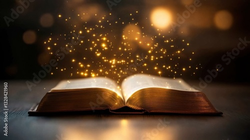 Enchanted Open Book with Glowing Magic Particles Floating Above, Captivating Fantasy and Imagination for Creative Inspiration and Storytelling