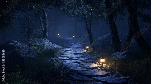 Enchanted Pathway Through a Mystical Forest Illuminated by Soft Lantern Glow in the Depths of a Serene Nighttime Atmosphere