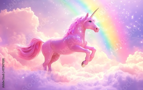 Enchanted Pink Unicorn Dancing in Rainbow Sky - Whimsical 3D Rendering with Sparkling Mane and Playful Expression