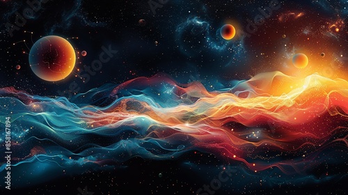 Enchanting abstract artwork showcasing the flow of quantum electrons, integrating scientific technology with intricate designs and vibrant colors to create a visually stunning piece. Illustration,