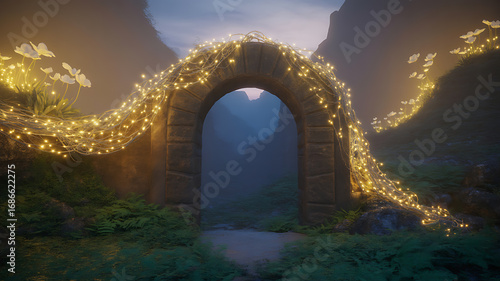 Enchanting ancient stone archway overgrown with glowing golden vines leading to a mysterious luminous portal in a mystical foggy forest