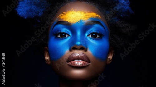 Enchanting Beauty in Blue and Gold: A striking studio portrait of a beautiful person, adorned with vibrant blue and gold artistic face paint, creating a captivating contrast and expressive allure.
