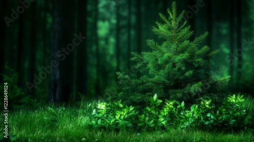 Enchanting Evergreen Sapling in Dark Forest Setting