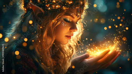 Enchanting Fairy Elf Casting Spell with Magical Glow - Low Angle View with Copy Space