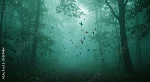 Enchanting Foggy Forest Path with Colorful Butterflies Mystical Nature Scene