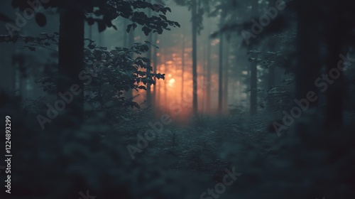 Enchanting forest bathed in early morning mist, with soft sunlight breaking through the trees, creating a magical and serene atmosphere that captures the tranquil beauty of nature at dawn.