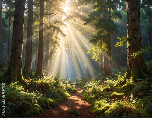 Enchanting forest landscape bathed in golden sunlight filtering through trees