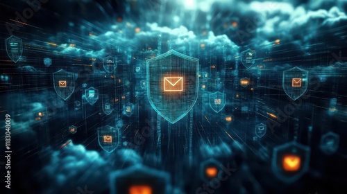 Enchanting Glowing Shield Surrounded by Bright Symbols on Dark Blue Background Evoking a Sense of Mystery and Intrigue in a Fantasy Realm Setting