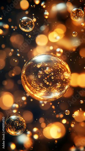 Enchanting golden bubbles gracefully drift in a shimmering liquid under soft, luminous light