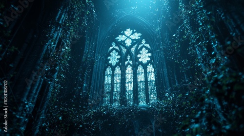 Enchanting Gothic Window Bathed in Moonlight - 3D Render with Intricate Details and Cinematic Lighting