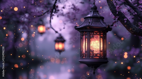Enchanting Illuminated Lantern Hanging from Blossoming Tree Branch at Dusk