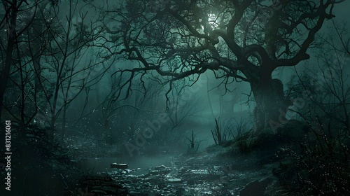 Enchanting Misty Forest Landscape with Gnarled Tree Branches and Mystical Atmosphere