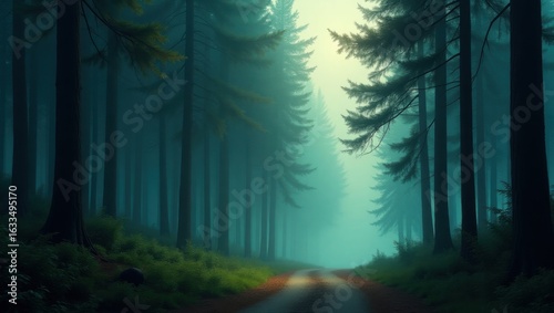 Enchanting misty forest path bathed in ethereal sunlight creating a tranquil and magical woodland atmosphere