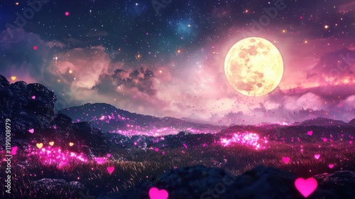 Enchanting moonlit landscape with floating hearts fantasy night digital art serene nature wide-angle view romantic concept