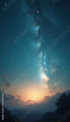 Enchanting Night Landscape: Milky Way Galaxy Illuminates Forest, Sky Glows at Twilight