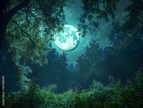 Enchanting Nighttime Forest Scene with Majestic Full Moon casting Ethereal Glow on Lush Foliage, Perfect for Dreamy Landscapes, Nature and Atmospheric Art Projects