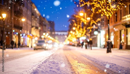 Enchanting Snowfall on a City Street Illuminated by Golden Holiday Lights