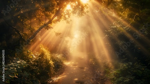 Enchanting Sunlight Filtering Through the Lush Verdant Forest Foliage Creating a Magical and Ethereal Ambiance