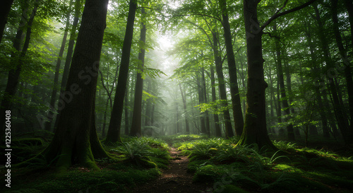 Enchanting Sunlit Path Through a Mystical Mossy Forest