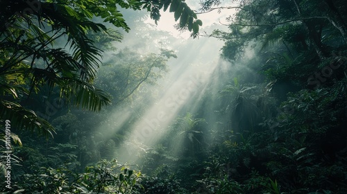 Enchanting Tropical Rainforest with Sunlight Streaming Through Lush Foliage and Mist, Creating a Magical Atmosphere of Serenity and Wonder